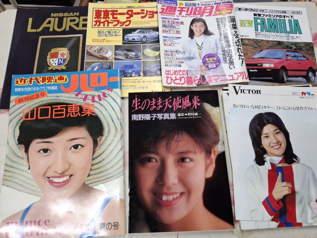 近代映画、週刊明星(Myojo)、アイドル写真集、旧車カタログ、東京モーターショーガイドブック、NISSAN LAUREL資料、NEW FAMILIA関連冊子など、まさに「時代の記録」と言える内容です。